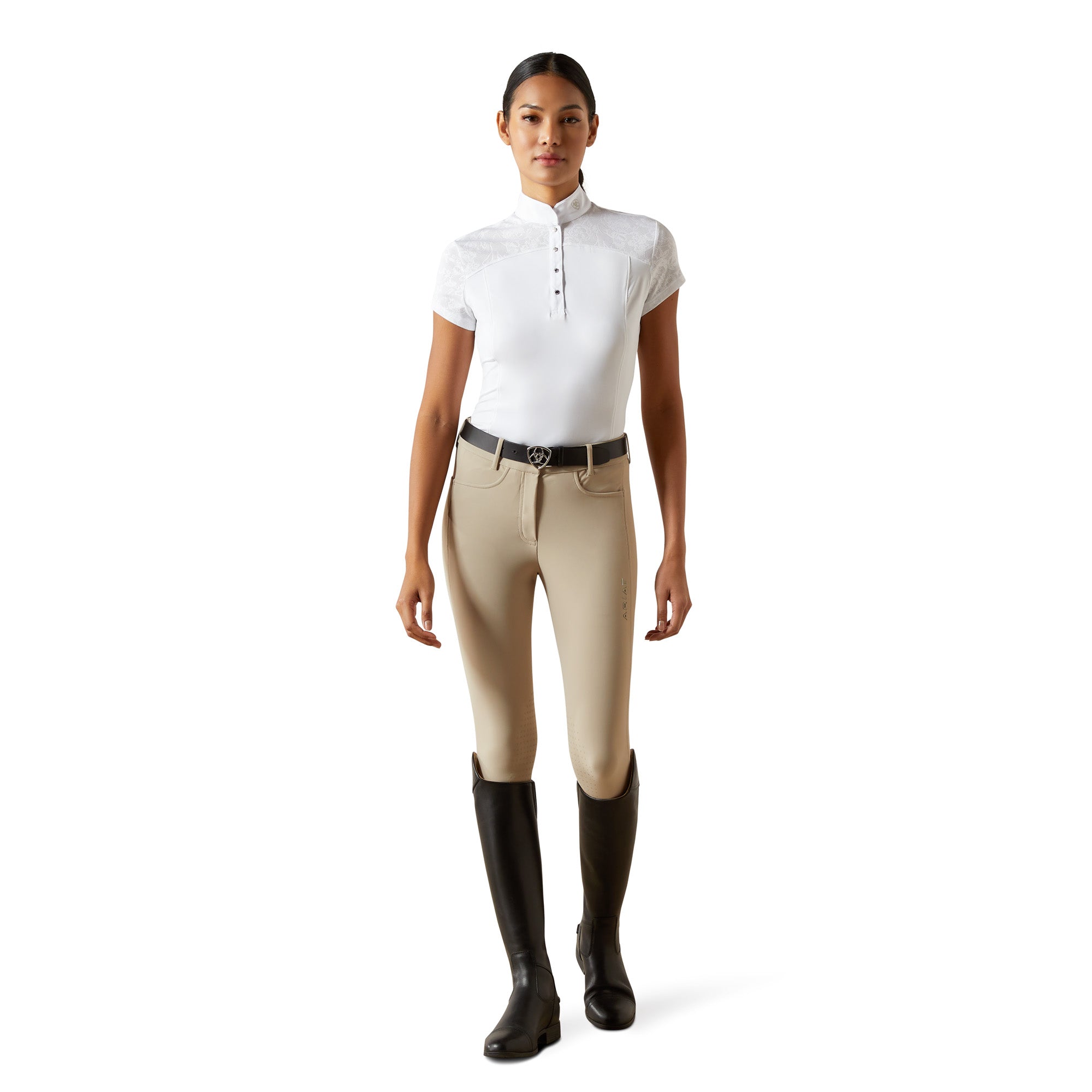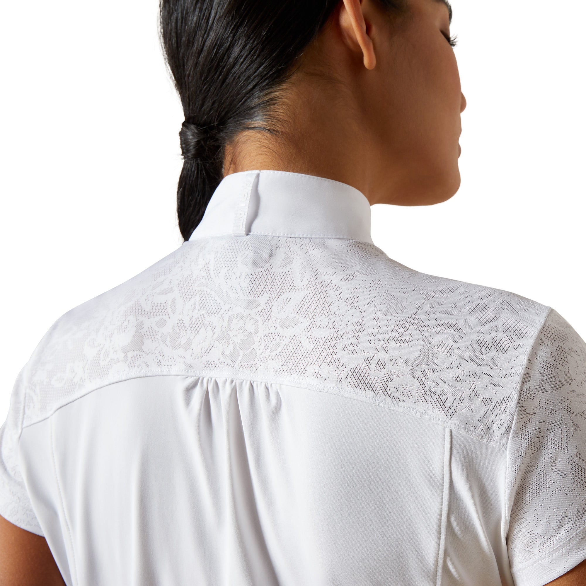 Elegance meets performance in the . Crafted from premium. technical jersey fabric and finished with floral mesh along the upper body and sleeves. it puts a fashion-forward spin on a show ring essential. We even added a modern collar and shiny snaps for a little extra style.