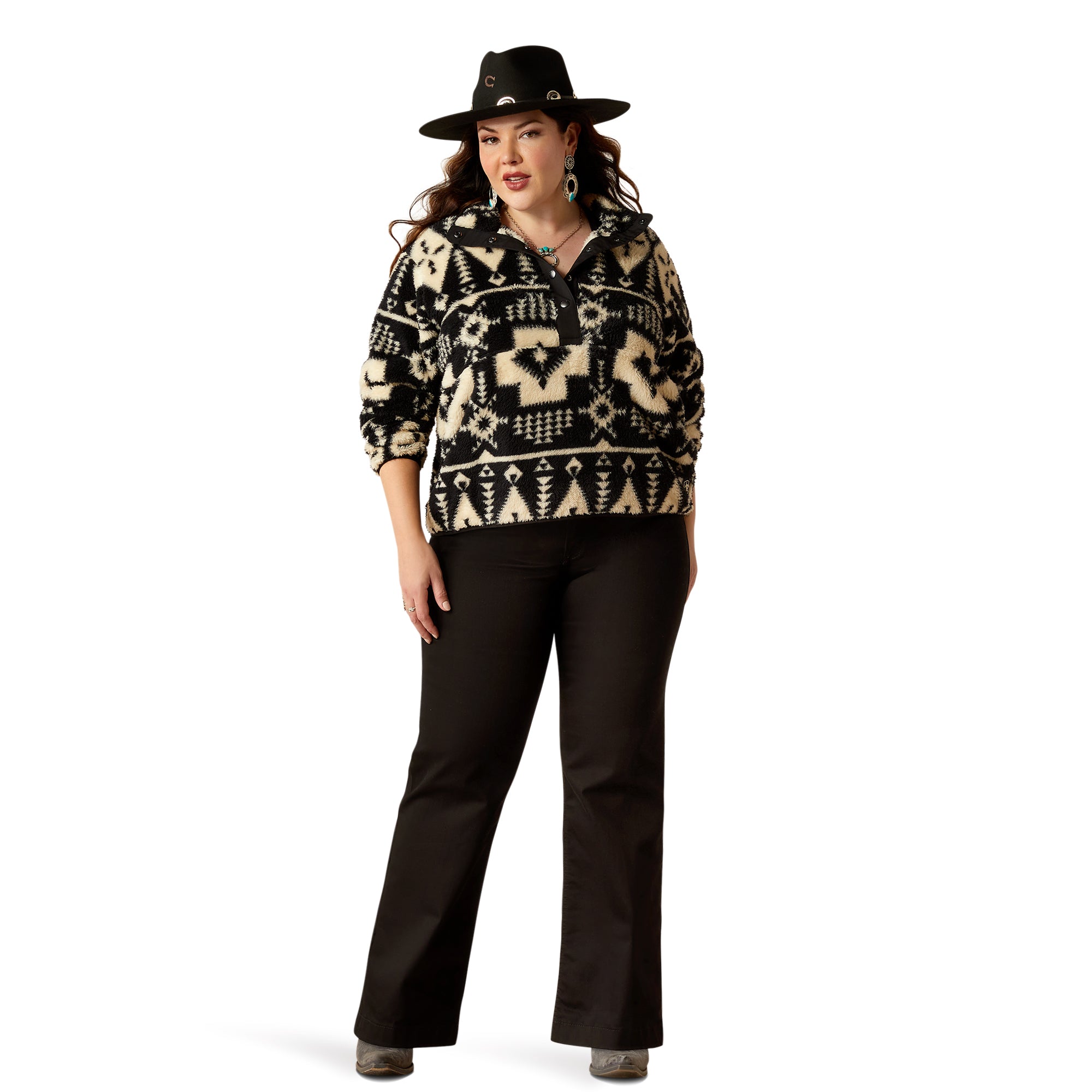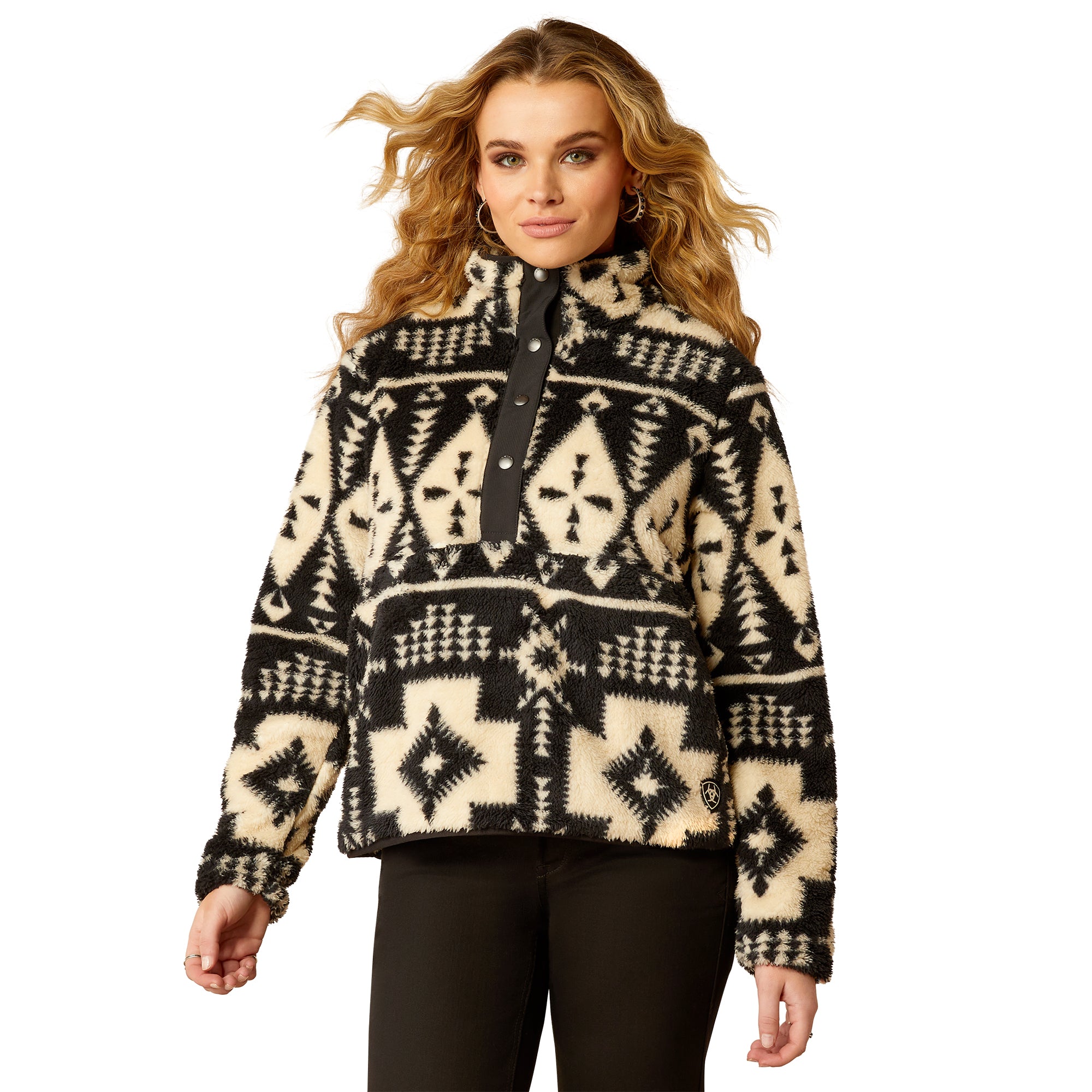 So soft. so plush you won’t want to take it off. With warm. high-pile fleece and a colorful print. this slightly cropped pullover is as happy lounging around at home as it is grabbing drinks with friends.