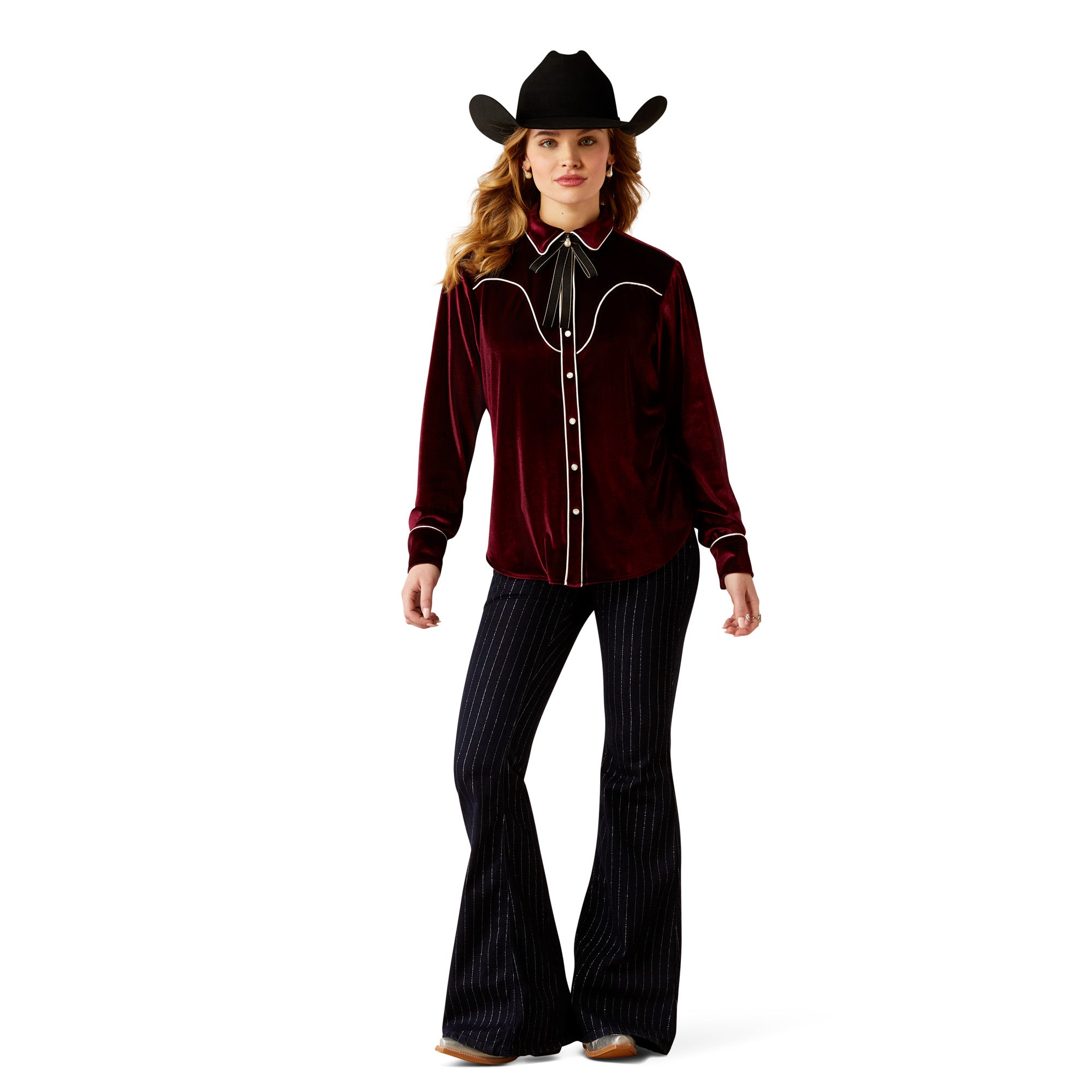 Shine under the arena lights or on the dance floor in this retro rodeo top. Soft velvet fabric and contrast piping nod to decades past. bringing vintage Western vibes to any outfit.