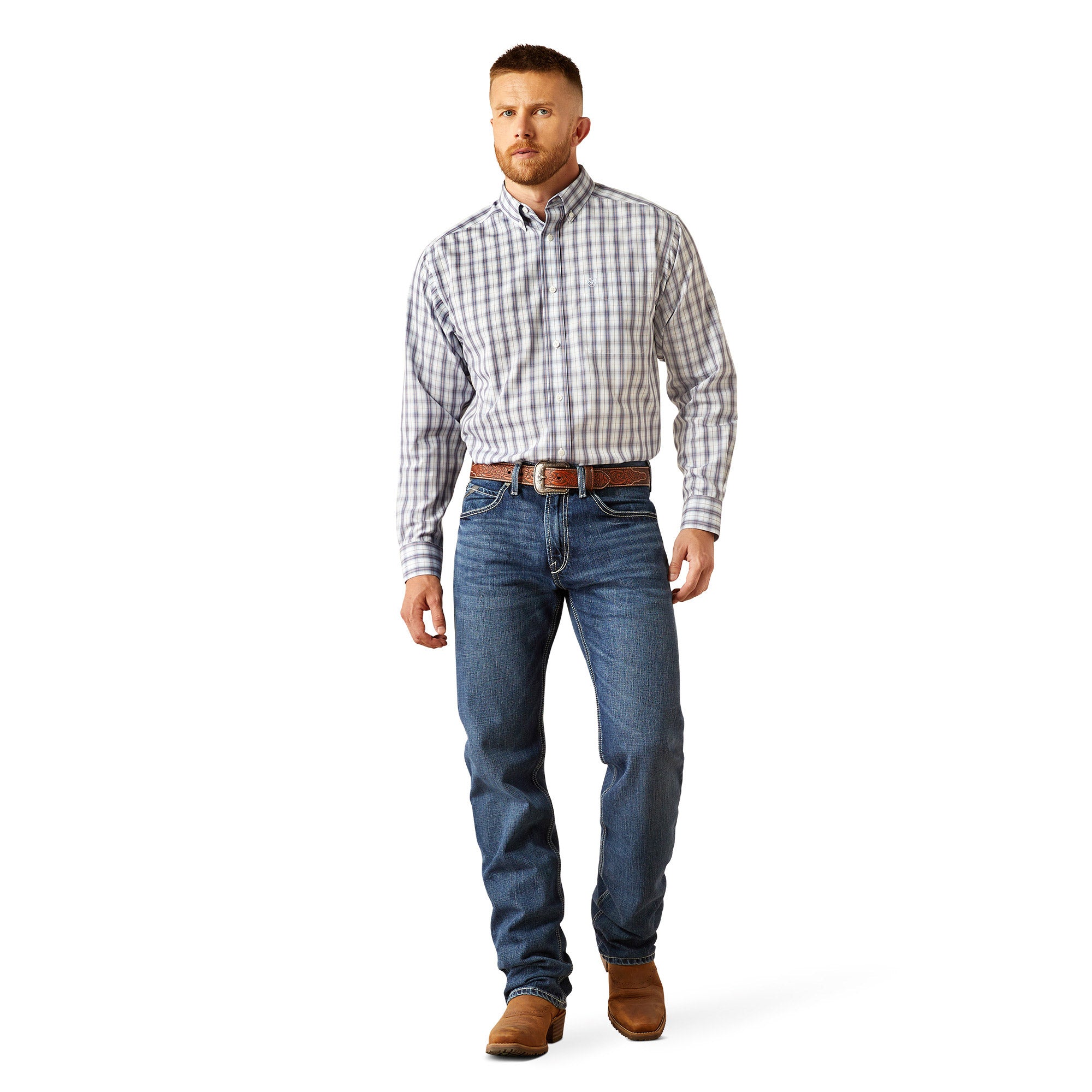 This is go-anywhere. do-anything denim. Ready to work hard or play hard. our relaxed-fit M2 jean has a stackable. boot-cut leg for a classic look.