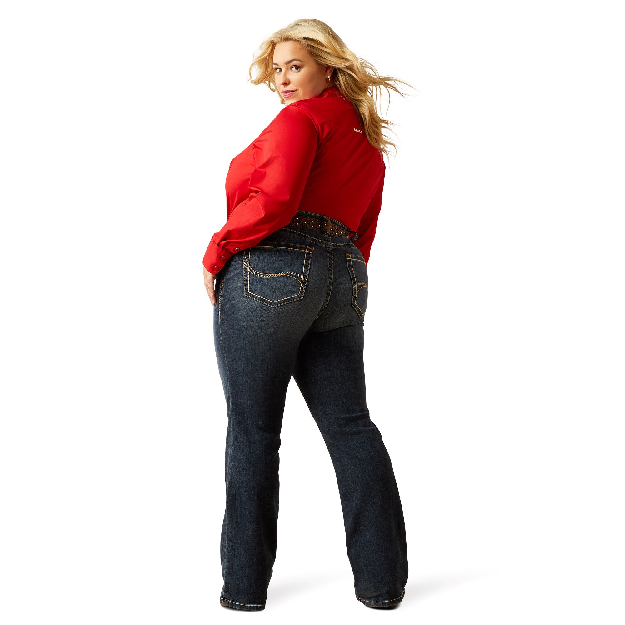 As classic as it gets. this boot-cut jean is your new everyday go-to. The flattering back-pocket design adds signature Ariat style. while the wearable mid-rise keeps you comfortable in and out of the saddle.