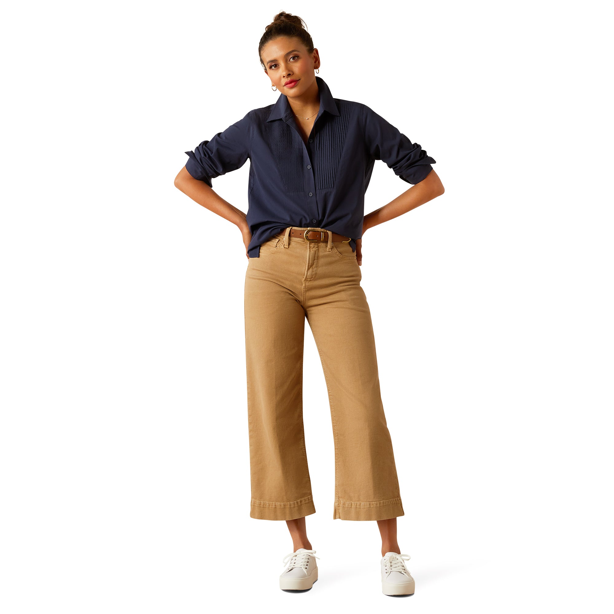With its luxurious drape and pleated front details. the is the denim shirt of your dreams. Easy to dress up or down. it’s versatile enough to wear with just about anything.