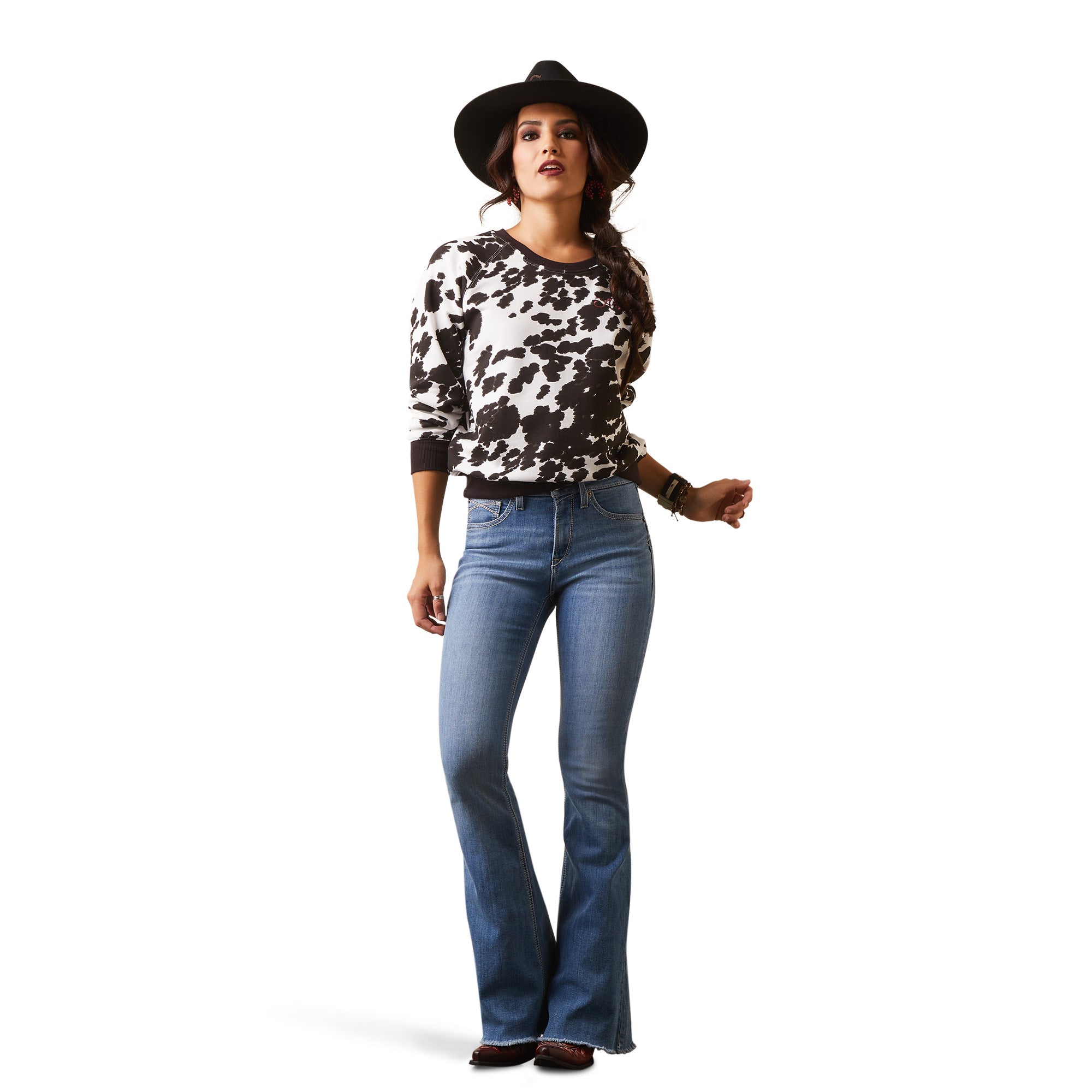Boring pullovers. moo’ve aside! This lightweight sweatshirt will freshen up your go-to layering system with a cowhide print and a stylized Ariat logo.
