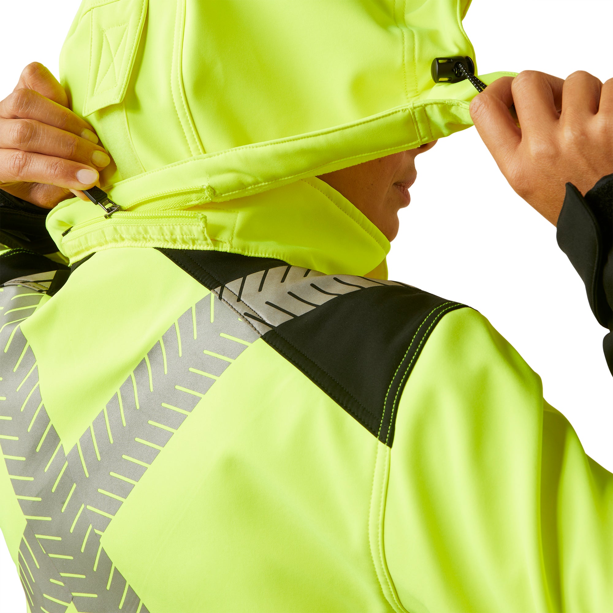 Built from durable softshell material. this wind- and water-resistant jacket helps keep you comfortable when weather rolls in. The adjustable. oversized hood fits securely over your hard hat. and reflective tape helps you stay seen and safe on the job.