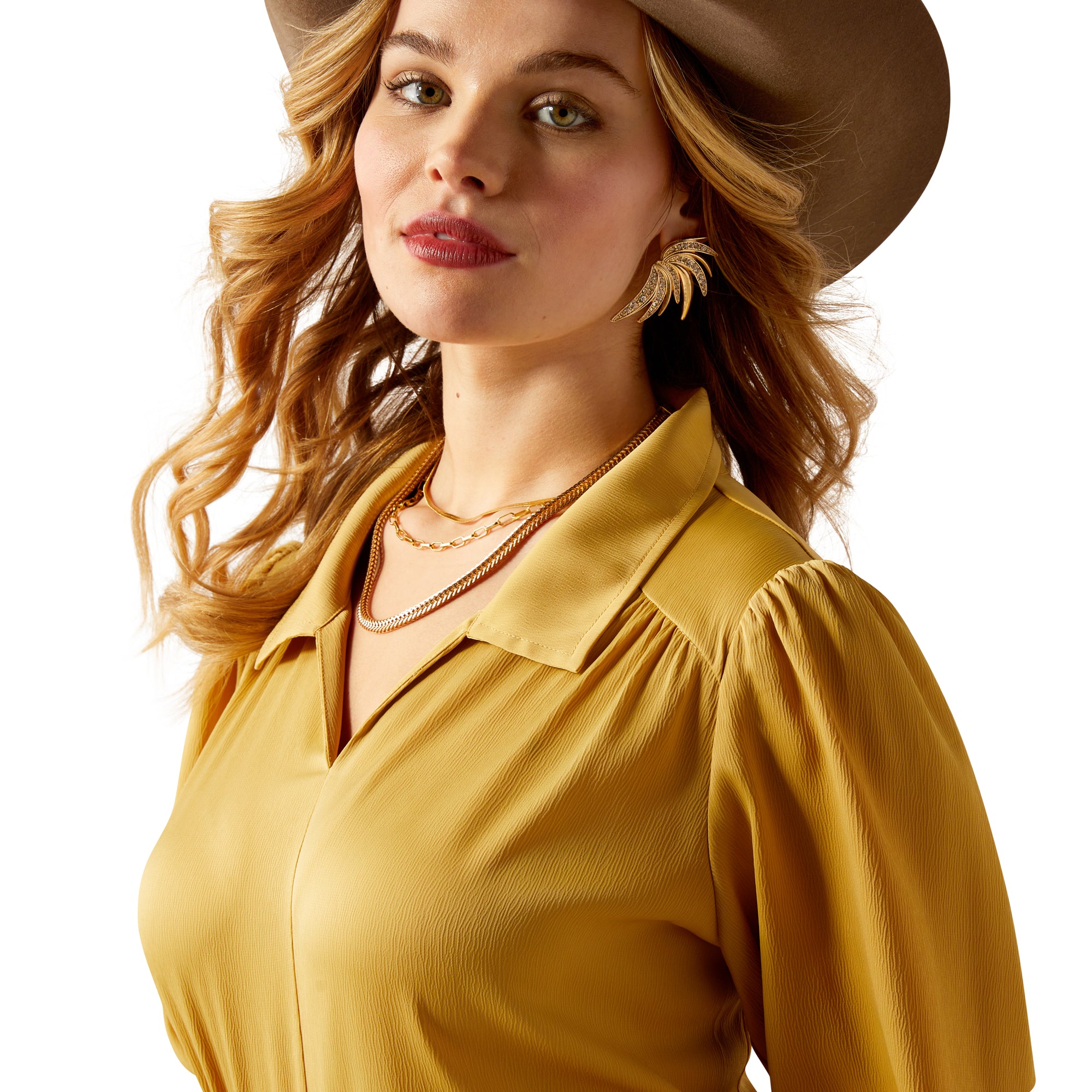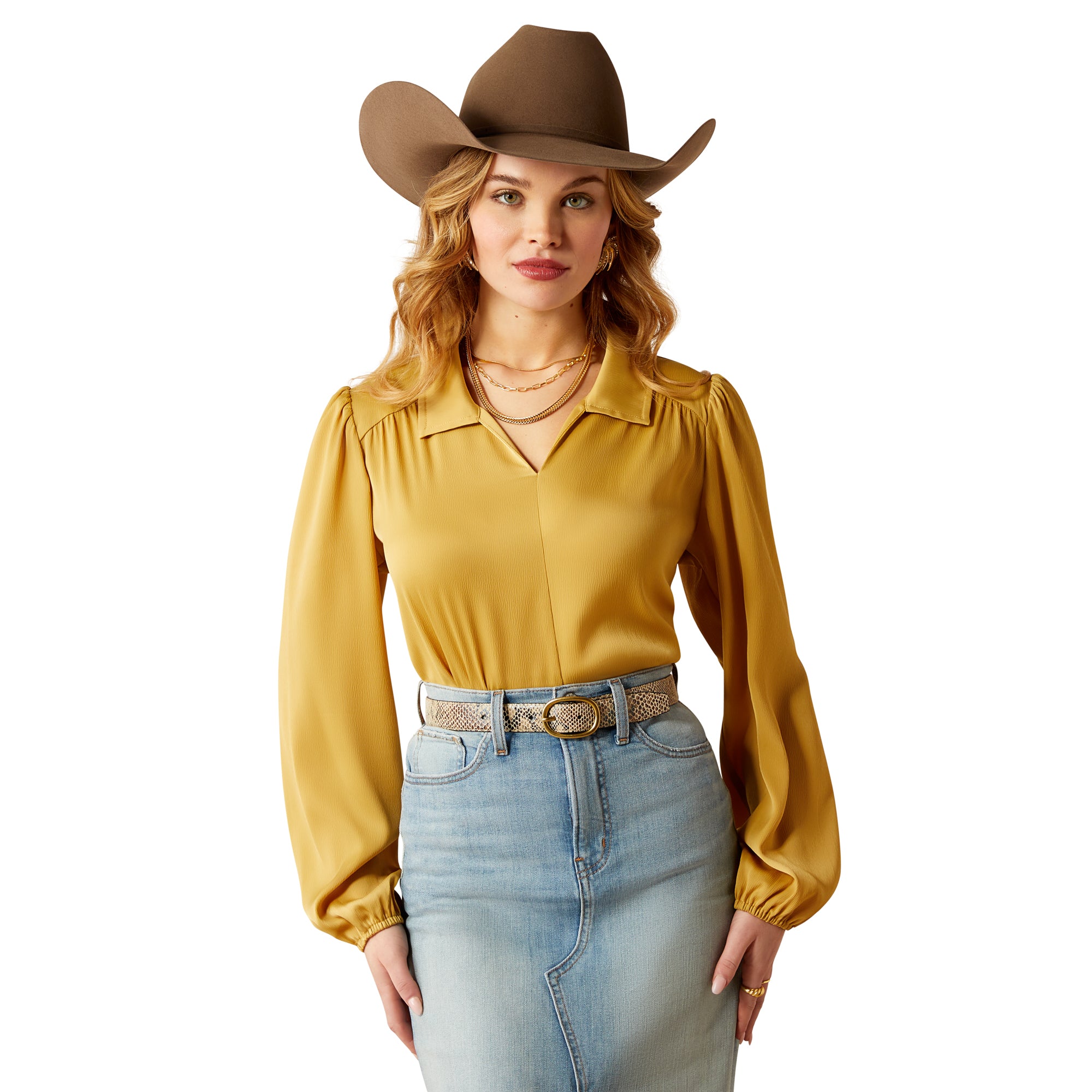 This elegant satin top has a flair for the dramatic. With its golden hue. glossy sheen. and billowy sleeves. it turns any outfit into a moment. The perfect plus-one for all your holiday events.